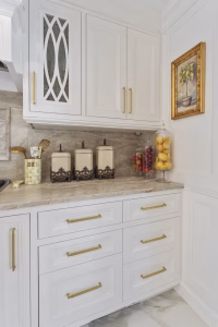 1. Recessed Panel Cabinets: The star of this kitchen is undoubtedly the custom cabinetry. We crafted recessed panel cabinets with meticulous attention to detail. Each panel is perfectly aligned, creating a sense of symmetry and order that’s pleasing to the eye. The recessed design adds depth and interest to the white surfaces, preventing the space from feeling flat or monotonous.