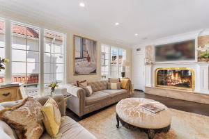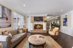 Moving from the kitchen to the living room, we encounter another showcase of our custom millwork expertise: a stunning fireplace and mantel that serves as the focal point of the space.