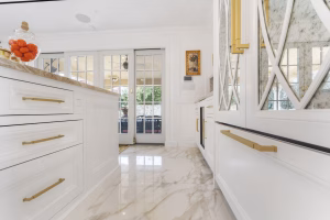 4. Gold Hardware: Against the pristine white backdrop, gold hardware serves as jewelry for the kitchen. These metallic accents add warmth and luxury, proving that sometimes, less really is more. The carefully chosen hardware complements the mirrored panels, creating a cohesive and sophisticated look.