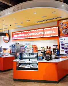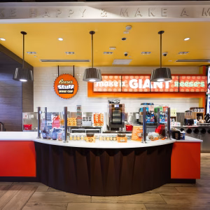 - Efficient Workflow: The back bar is thoughtfully designed to allow staff to prepare custom Reese’s cups with ease. From accessible compartments for mix-ins to a smooth workflow layout, every detail supports efficiency.