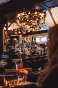 Solid Wood Bar Top – A showstopping oak bar, stained and lacquered to perfection, serving as a focal point for guests.