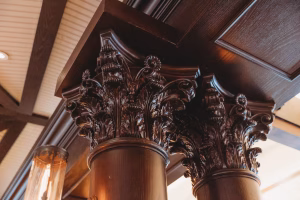 Custom Oak Wood Carved Column Caps – Designed to match transom panels with recessed panel molding, creating seamless architectural flow.