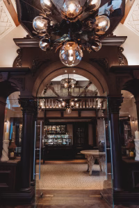 Traditional Carved Doorway & Corinthian Corbels – Guests are welcomed through a handcrafted, intricately carved wooden entrance that reflects the restaurant’s historic character.