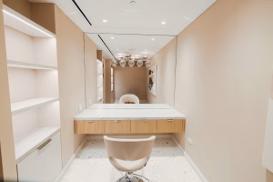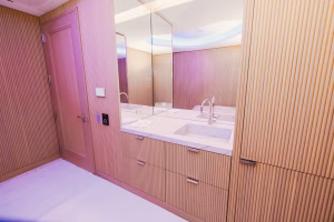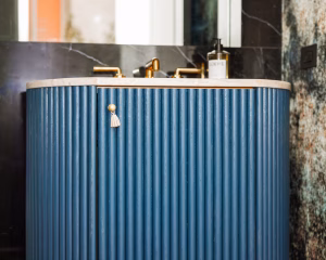 Beyond wall treatments, tambour’s application extends to custom furniture pieces within the spa. One standout feature is the floating vanity, adorned with fluted tambour drawers. This design not only maximizes floor space, enhancing the room’s openness, but also introduces a sculptural element that anchors the space.