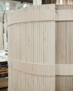 What sets our tambour work apart is the attention to detail. Each slat is numbered and quality-checked, ensuring consistency and excellence. The result is a mesmerizing wave of woodwork that adds both structure and softness to the spa’s interiors.