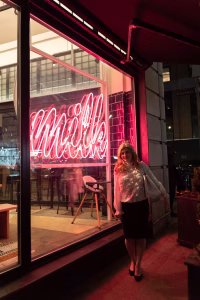 One of the standout features is the series of handcrafted wall panels finished in sleek black lacquer. These panels serve as a sophisticated backdrop, allowing vibrant neon signage and colorful confections to take center stage. The high-gloss finish not only adds depth but also reflects the lively energy synonymous with Milk Bar.
