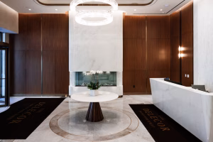 Central to the space is a beautifully sculpted, concave reception desk designed to welcome residents and guests with quiet sophistication. Highlights include: