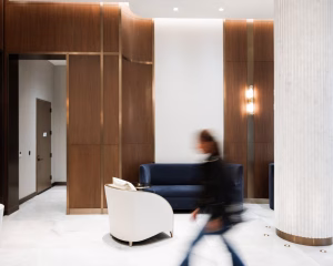 One of the most exciting things about a project like this is its broad appeal. While it was built for an Upper East Side lobby, this level of custom lobby millwork, walnut wall paneling, and custom reception furniture would fit beautifully in: