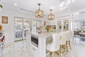 Architectural details such as panel-ready refrigerators, appliance garages, flush cabinet fronts, custom moldings, and concealed doors help the kitchen read as a cohesive environment. Instead of cabinetry looking like furniture placed against walls, it becomes part of the room’s structure.